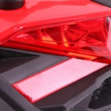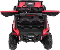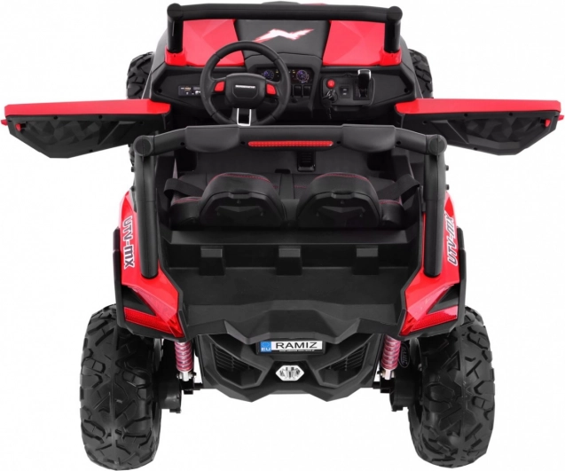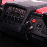 Wnętrze zachwyca wentylowanym siedzeniem z eko skóry z pasami bezpieczeństwa, realistycznym startem na kluczyk oraz otwieranymi drzwiami z blokadą. Rozbudowany panel multimedialny oferuje MP3, USB, SD, AUX, Bluetooth, radio FM oraz dźwięki w kierownicy. Rodzice docenią zdalne sterowanie 2,4 GHz z trzema prędkościami i awaryjnym STOP. Praktyczny tylny schowek i oświetlenie LED z przodu i z tyłu dopełniają topowe wyposażenie.