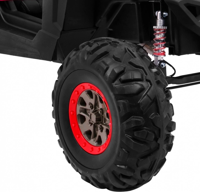 Moc zapewniają 4 silniki 45 W zasilane podwójnym akumulatorem 2 × 12 V / 7 Ah. Przełączanie między napędem 2×4 i 4×4 pozwala dopasować jazdę do terenu, a płynny start i sprężyste zawieszenie z regulowanymi, śrubowymi amortyzatorami gwarantują komfort na nierównościach. Duże koła EVA 35 × 15 cm zapewniają stabilność i cichą pracę.