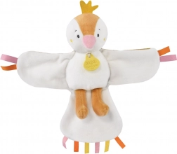 Ten mięciutki ptaszek w odcieniach żółci i pomarańczu zachwyca delikatnością i kojącą obecnością dźwiękową. Kolorowe wstążeczki na skrzydełkach, ogonku i główce zachęcają do chwytania, gryzienia i ćwiczenia małej motoryki. Stylowe pudełko z kwiatowym motywem sprawia, że to piękny prezent dla świeżo upieczonych rodziców.