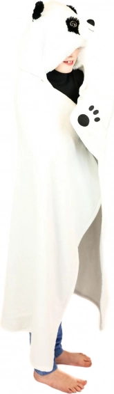 Uroczy i mięciutki koc z polaru z kapturem w stylu pandy ucieszy każde dziecko. Oferuje kaptur ze zwierzęcym motywem, narożne kieszenie w kształcie łapek oraz przyjemne ciepło w domu i na zewnątrz. Dzięki kapturze i kieszeniom jest idealny nie tylko do wtulania się, ale też do zabawy i rozwijania wyobraźni. Łatwa pielęgnacja, wymiary 130 × 100 cm, materiał 100% poliester.