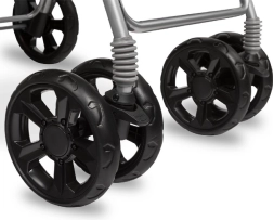 Trwałe koła EVA z miękką amortyzacją przedniej osi tłumią drgania. Blokada do jazdy na wprost pomaga na kostce brukowej i nierównościach.