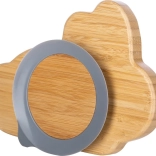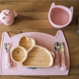 Talerzyk wykonany jest w 100% z bambusa z nietoksycznym lakierem i wyróżnia się gładką powierzchnią, którą łatwo się czyści. Praktyczny kształt zwierzątka motywuje dzieci do jedzenia i umila każdy posiłek.