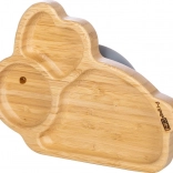 Uroczy dziecięcy talerzyk w kształcie króliczka z wysokiej jakości bambusa z odpinaną przyssawką do solidnego mocowania do stołu. Ma 3 przegródki dla przejrzystego serwowania, bezpieczne materiały bez BPA, PVC, ftalanów i melaminy oraz łatwą pielęgnację.