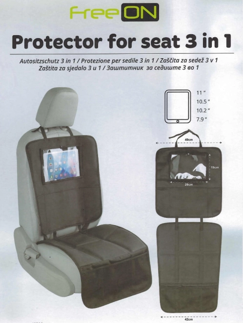 W zestawie znajduje się zestaw siatkowych kieszeni na zabawki, przekąski i inne drobiazgi, a także przezroczysta kieszeń na tablet lub telefon dla rozrywki podczas jazdy. Może być używany jako jedna integralna część do ochrony siedzenia i oparcia lub oddzielnie jako ochraniacz siedzenia oraz ochraniacz tyłu przednich siedzeń. Uniwersalny kolor zapewnia dopasowanie do każdego wnętrza pojazdu, a jego konstrukcja zaprojektowana jest dla wygody i funkcjonalności.
