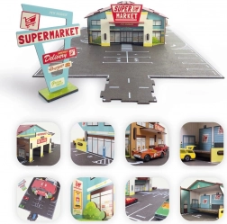 Supermarket z restauracją burger, parkingiem i oznakowaniem tworzy wiarygodną scenę, która wciąga dzieci do zabawy i rozwija ich wyobraźnię.