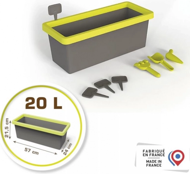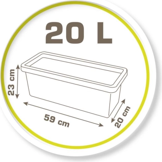 Skrzynka na kwiaty lub warzywa, pojemność 20 litrów. W zestawie 4 znaczniki do wbijania, wypychacz, grabki i łopatka. Strefa zatrzymująca wodę, dno można przewiercić w razie potrzeby. Wymiary skrzynki 59 × 21,5 × 24 cm.