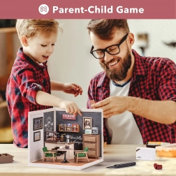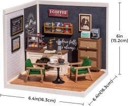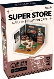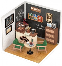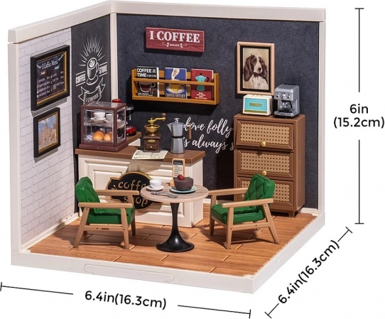Wejdź do świata miniaturowej kawiarni, gdzie każdy detal cieszy oko – od krzeseł i stolika po ekspres do kawy i dekoracje ścienne. Zestaw dostarczany jest w częściach, a po złożeniu tworzy efektowną scenę, która ociepli półkę, biurko czy witrynę. Oświetlenie LED nadaje modelowi wyjątkowy klimat.