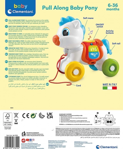 Interaktywny pociągany kucyk z linii Clementoni Baby został zaprojektowany, aby motywować dzieci do ruchu i wspierać ich naturalną ciekawość. Przyciskami na siodle uruchamia się zabawne dźwięki i melodie, które pobudzają słuch i uczą związku przyczyna–skutek. Dzięki sznurkowi dzieci mogą łatwo prowadzić kucyka, ćwicząc stabilność podczas chodzenia.