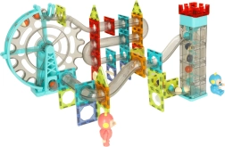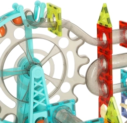 Ten kolorowy zestaw magnetyczny pozwala dzieciom budować stabilne wieże, tunele i konstrukcje 3D, jednocześnie obserwując, jak kulki przemieszczają się przez przezroczyste rurki i rampy. Moduł z obracającym się kołem i windą utrzymuje kulki w ruchu, a element dźwiękowy dodaje radosną melodię. Części wykonane są z wytrzymałego, przezroczystego plastiku z wbudowanymi magnesami, które ułatwiają szybkie i kreatywne budowanie.