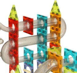 Silne magnesy utrzymują konstrukcje stabilnie, a przezroczyste rurki pozwalają dzieciom śledzić każdy ruch kulek. Budowanie jest szybkie, stabilne i pełne zabawy.