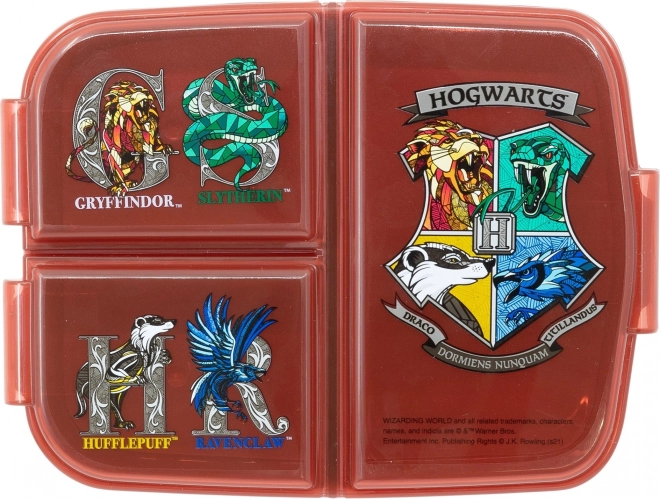 Praktyczny dziecięcy pojemnik śniadaniowy z trzema przegródkami z motywem HARRY POTTER utrzymuje jedzenie oddzielone i świeże. Wykonany z trwałego plastiku, idealnie mieści się w plecaku szkolnym, a dzięki bezpiecznemu zamknięciu sprawdzi się w podróży, w szkole i na placu zabaw.