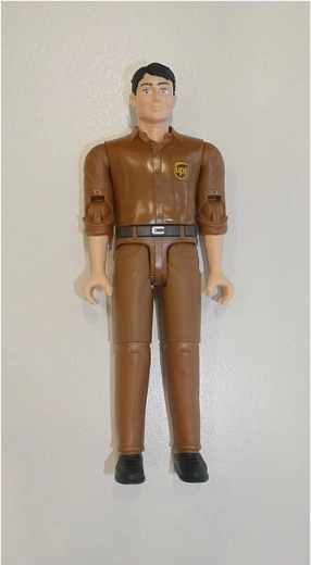 Ruchoma figurka kierowcy UPS, odpowiednia jako dodatek do modeli Bruder. Mężczyzna w typowym brązowym uniformie. Wyprodukowano w Niemczech, z wysokiej jakości materiałów. Główne cechy: ruchoma figurka, wyprodukowano w Niemczech