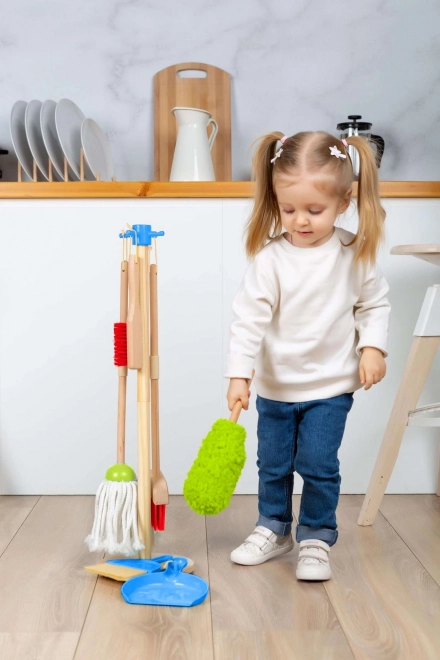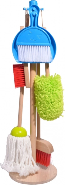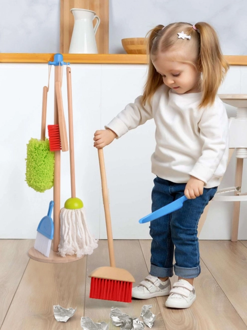 Wszystkie narzędzia do sprzątania można łatwo zawiesić na stabilnym drewnianym stojaku, co ułatwia ich przechowywanie i utrzymanie porządku.