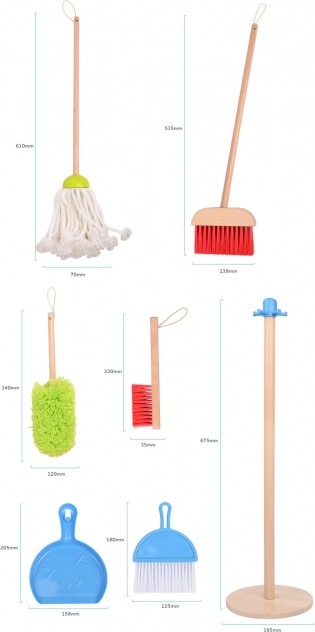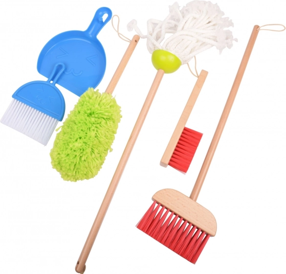 - Duża miotła, mop, ściereczka do kurzu, mała szczotka z rączką, plastikowa zmiotka z szufelką, drewniany stojak