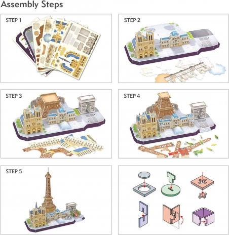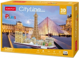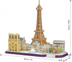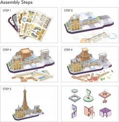 Puzzle 3D City Line Paryż to ekscytująca zabawa dla dzieci i dorosłych. Opakowanie zawiera 114 elementów puzzli wykonanych ze specjalnego materiału przypominającego piankę. Puzzle są ponumerowane, wycięte i umieszczone na arkuszach. Elementy łatwo wycisnąć z arkusza bez użycia siły i złożyć je zgodnie z dołączoną instrukcją, bez użycia kleju ani specjalnych narzędzi.
