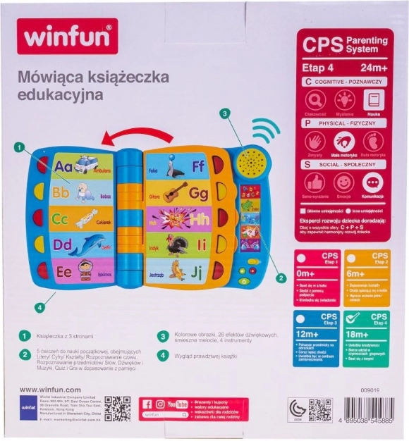 Ta książeczka została zaprojektowana tak, aby wspierać rozwój małej motoryki oraz koordynacji ręka-oko poprzez przewracanie stron i precyzyjne naciskanie przycisków. Pomaga także rozwijać umiejętności słuchowe i wymowę.