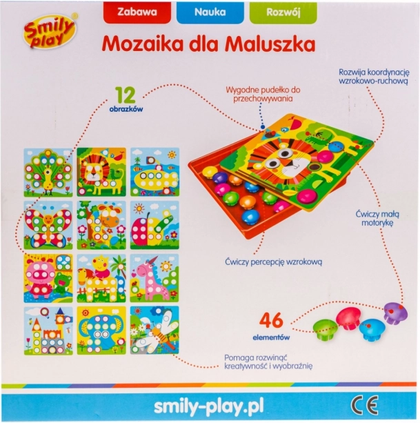Mozaika nie wymaga baterii, wspiera koncentrację i naturalnie prowadzi do ćwiczenia chwytu, koordynacji oko–ręka oraz rozróżniania kolorów. Trwałe, nietoksyczne wykonanie oraz praktyczne pudełko z pokrywką zapewniają bezpieczne i wygodne przechowywanie oraz przenoszenie zabawki.