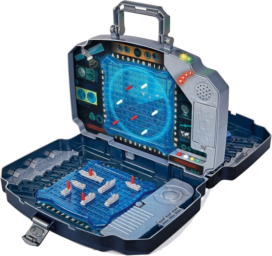 Przenośna elektroniczna gra Bitwa morska w wytrzymałej walizce z dwiema niebieskimi siatkami gry, schowkami oraz efektami świetlnymi i dźwiękowymi. Przeznaczona dla 2 graczy, łatwe śledzenie trafień dzięki czerwonym i białym kołeczkom oraz intuicyjna obsługa dla dzieci od 5 lat. Idealna w domu i w podróży.