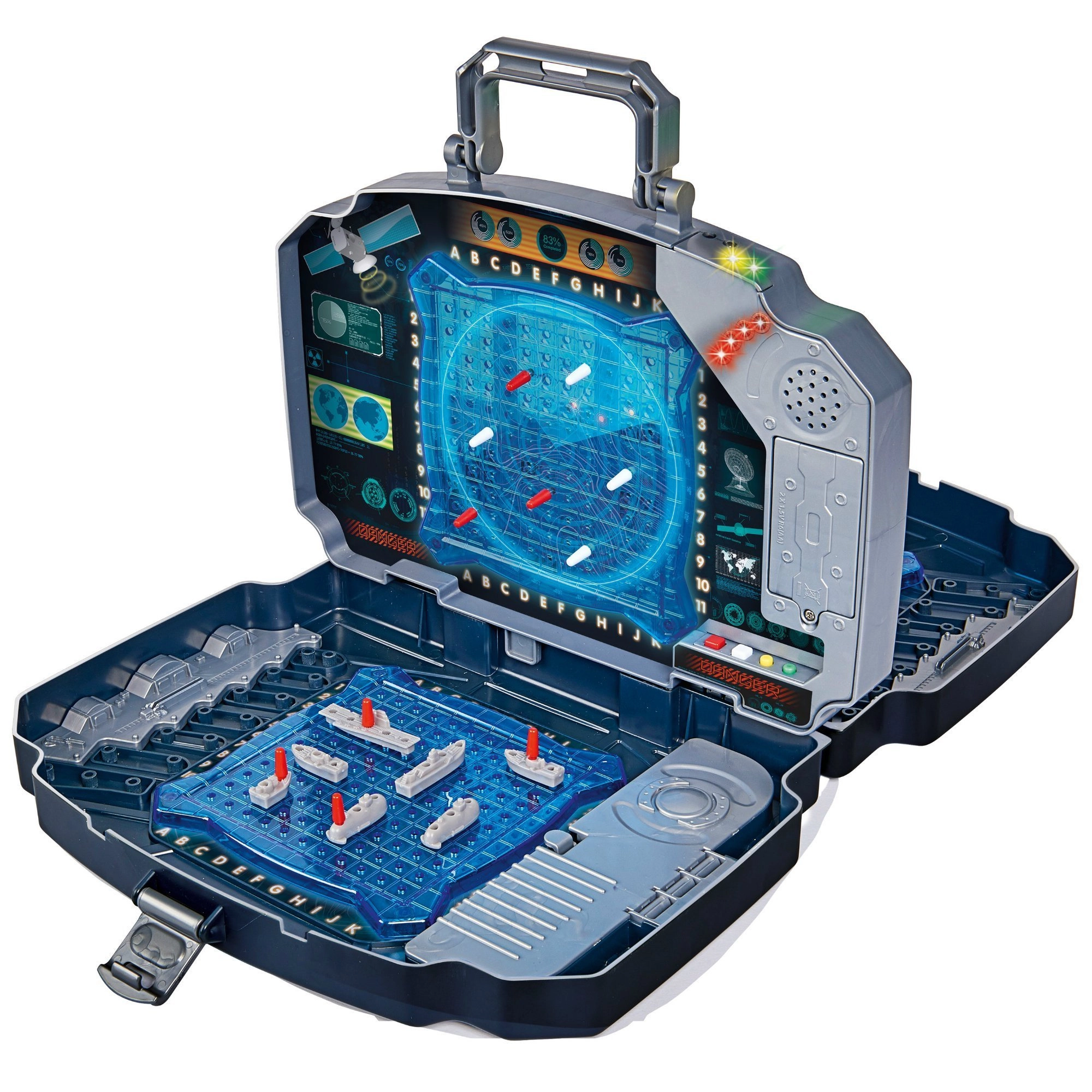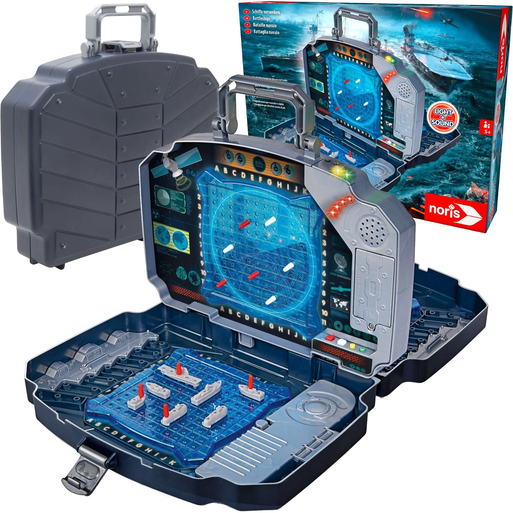 Przeżyj klasyczną Bitwę morską w nowoczesnym wydaniu. Solidna grafitowa walizka kryje dwie niebieskie siatki do rozmieszczania statków oraz panel środkowy do zaznaczania strzałów w przeciwnika. Zintegrowane efekty świetlne i dźwiękowe wyraźnie sygnalizują trafienie i pudło – gra jest dzięki temu przejrzysta, emocjonująca i wciągająca dla całej rodziny.