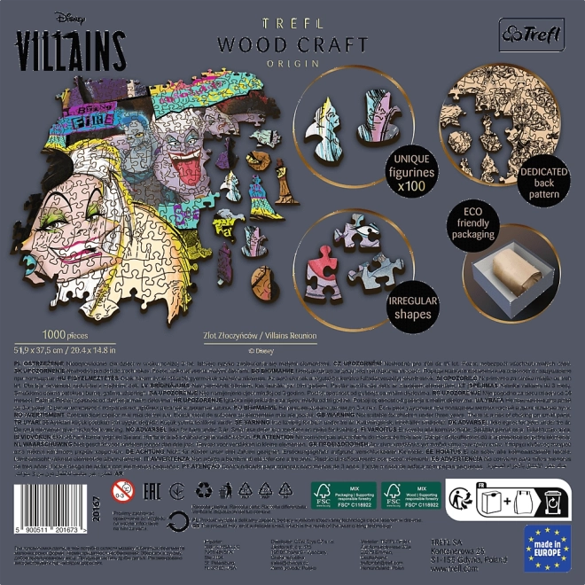 Odkryj premiumowe, drewniane, dwustronne puzzle TREFL z serii Wood Craft Origin z motywem Disney: Spotkanie złoczyńców. Dzięki precyzyjnemu cięciu laserowemu elementy idealnie do siebie pasują, krawędzie są gładkie, a układanka zapewnia niepowtarzalne wrażenia dla miłośników puzzli i świata Disneya. Czeka na Ciebie 100 unikalnie ukształtowanych elementów, dwustronny nadruk oraz ekologiczne opakowanie bez plastiku.