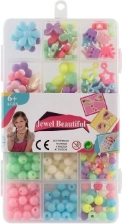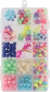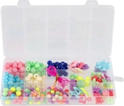 Odkryj radość tworzenia z kompletnym zestawem koralików, idealnym dla początkujących i małych twórców. W pudełku znajdziesz szeroką gamę kolorów i kształtów – od kuleczek po kwiatuszki – a dzięki dołączonemu sznurkowi możesz od razu zacząć wytwarzać oryginalne bransoletki i naszyjniki. Przezroczysty organizer z przegródkami zapewnia, że koraliki pozostaną posegregowane i zawsze pod ręką.