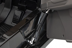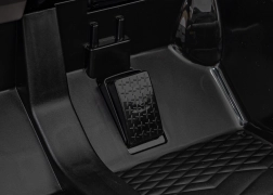 Bezpieczeństwo i wygodę zapewniają miękkie koła EVA z doskonałą amortyzacją, siedzisko z eko skóry z eleganckim przeszyciem oraz pilot 2,4 GHz z trzema prędkościami i awaryjnym przyciskiem STOP. Pakiet świetlny z przednimi i tylnymi światłami LED dodaje realizmu. Panel multimedialny oferuje Bluetooth, USB, MP3, wgrane melodie oraz wejście AUX do podłączenia telefonu lub odtwarzacza.
