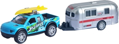 SUV z hakiem holowniczym i kempingową przyczepą, swobodnie obracające się koła oraz dopracowane nadruki dla autentycznych wrażeń.