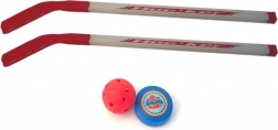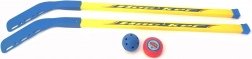 Zestaw zawiera plastikową hokejkę, plastikową piłeczkę i krążek.
