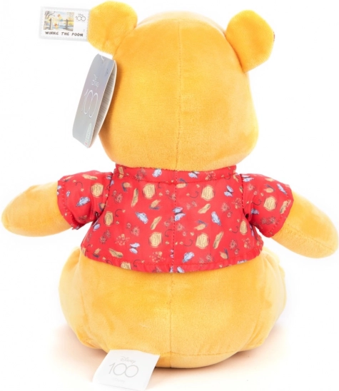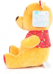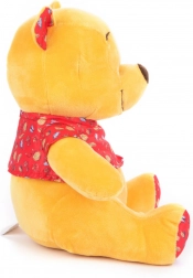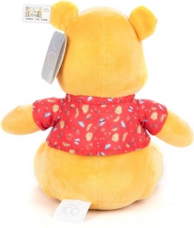Miś Puchatek wykonany jest z miękkiego żółtego pluszu i nosi czerwoną koszulkę z dekoracyjnym wzorem, co czyni go idealnym do przytulania.