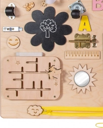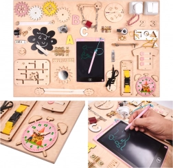 W zestawie znajduje się bogata paleta aktywności: elektroniczny magiczny szkicownik z rysikiem, kolorowe koła zębate, suwak, dzwonek rowerowy, różne rodzaje zasuwek i haczyków, but do sznurowania, koszula z guzikami, drewniane cyfry i litery, kółko z liczbami, labirynt z ruchomym rekinem, tabliczka kredowa w kształcie łodzi, miarka, włącznik światła, gniazdo z wtyczką, rzep, bezpieczne lusterko w rakiecie, kłódka z kluczykami oraz pasek z klamrą.