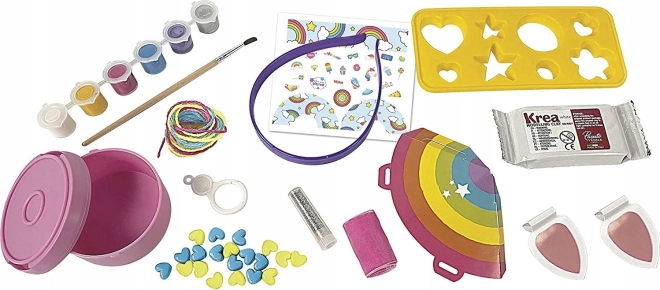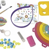 Kreatywny zestaw do wykonania czterech dodatków w kolorach tęczy. Pozwól dziecku puścić wodze fantazji z masą plastyczną, farbami temperowymi, wełną i innymi materiałami.
