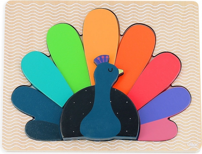 Barwna drewniana układanka z kolorowym pawiem, która rozwija małą motorykę oraz umiejętność rozpoznawania kształtów i kolorów u dzieci.