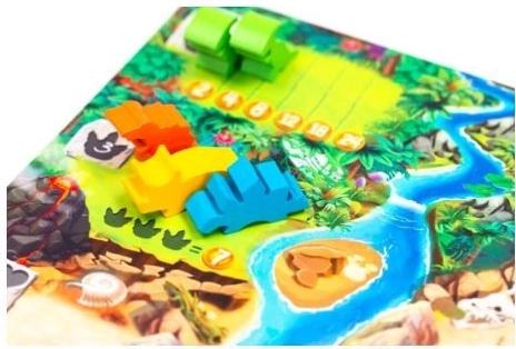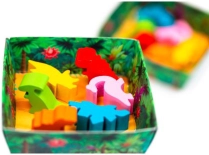 5 dwustronnych plansz, 60 drewnianych pionków dinozaurów (6 gatunków), specjalna kostka, miseczki na pionki, woreczek do losowania dinozaurów