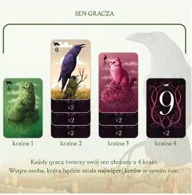 Podczas rozgrywki odwiedzisz 4 krainy ze snów! Spotkasz tam przyjazne koty oraz złowieszcze wrony, które wyślesz do snów swoich przeciwników. Zwycięzcą zostanie ten, kto będzie miał we śnie najwięcej kotów.