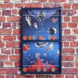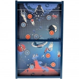 Dzięki wymiennemu środkowi łatwo dobierzesz trudność: klasyczny jeden centralny otwór do ćwiczenia precyzji lub bardziej wymagająca deska z dwoma otworami poza środkiem dla doświadczonych strzelców. Solidna drewniana konstrukcja, płynny ślizg krążków i retro kosmiczna grafika gwarantują długotrwałą zabawę i stylowy wygląd planszy.