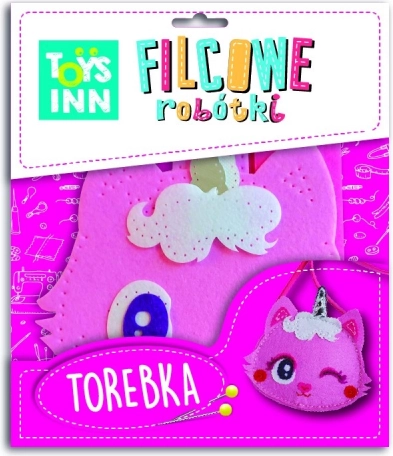Zestaw kreatywny do szycia małej różowej torebki z motywem kotka. Bezpieczny dla dzieci, zawiera wszystko, co potrzebne. Gotowa torebka 18 × 12,5 × 4 cm.