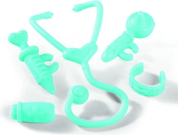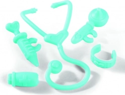 W zestawie znajdują się narzędzia lekarskie, takie jak stetoskop, strzykawka i inne dodatki, które wspierają kreatywną i edukacyjną zabawę.