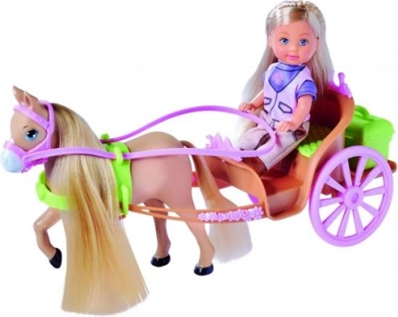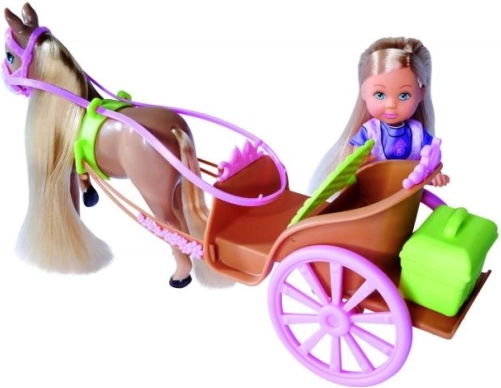 Konik ma długą grzywę i ogon, które można czesać i zdobić dołączonymi spinkami. Za siedzeniem powozu znajduje się tajna skrytka na drobiazgi i akcesoria – w zestawie jest także zielone pudełko na potrzeby związane z konikiem. Zabawa z Evi wspiera wyobraźnię, rozwój emocjonalny oraz odpowiedzialność.