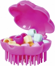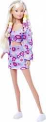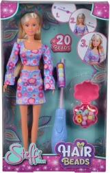 Lalka Steffi w kwiecistym, dwuczęściowym stroju, z haczykiem do nawlekania koralików na pasmo włosów, kolorowymi koralikami, gumką do mocowania oraz grzebieniem ze schowkiem. Wysokość lalki: 29 cm.
