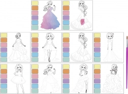 - 8 czarno-białych obrazków, pędzel, 6 akwareli