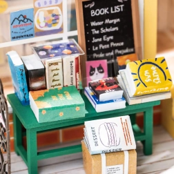 Półeczki z książkami, uroczy miś, kwiaty i dodatki – każdy detal współtworzy realistyczny i magiczny wygląd mini księgarni.