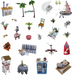 W zestawie znajdują się miniaturowe elementy wyposażenia i dekoracje – od hamaka i pianina po kwiaty i lampki. Wszystko, czego trzeba do realistycznego i przytulnego wnętrza.