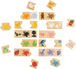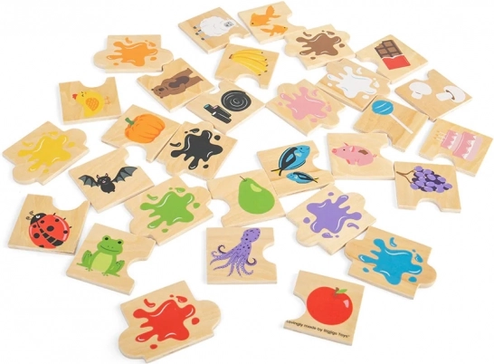 Zabawne drewniane dydaktyczne puzzle od Bigjigs Toys uczą dzieci rozpoznawać kolory za pomocą 30 elementów w 10 kolorach. Łączą trójki (zwierzę, przedmiot, kolor), trenują koordynację ręka–oko, logiczne myślenie i poszerzają słownictwo. Odpowiednie dla dzieci od 2 lat.
