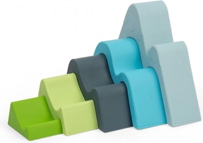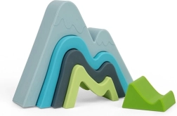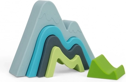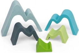 Pięć profilowanych elementów w kształcie gór można układać, wkładać jeden w drugi i łączyć bez końca. Dzieci rozwijają w ten sposób wyobraźnię i małą motorykę.