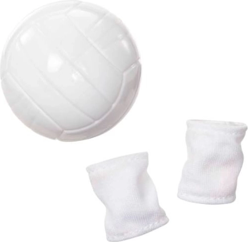 W komplecie znajduje się biały piłka do siatkówki oraz dwa dopasowane bransoletki, które uzupełniają sportowy wygląd lalki.