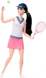 Lalka Barbie Kariera Tenisistka ma łącznie 22 stawy, co pozwala dzieciom stać się częścią ich sportowych fantazji. Nosi sportowy strój składający się z białego topu z niebieskimi akcentami i różowej spódniczki, uzupełniony czapką tenisową.
