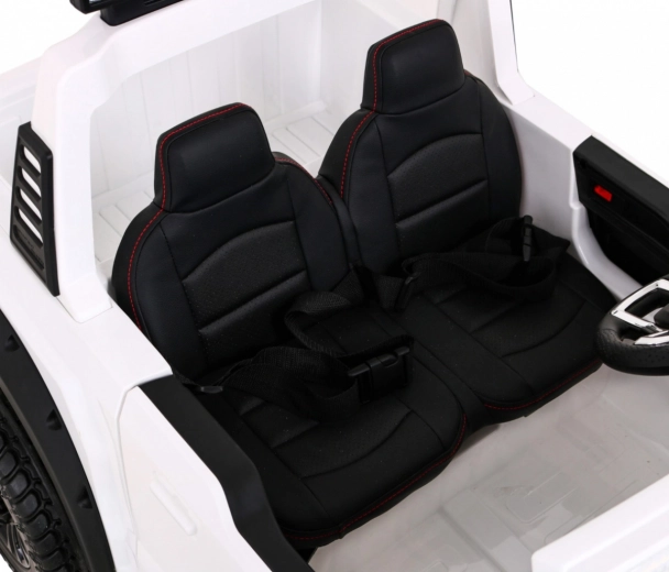 Komfort podkreślają siedzenia z ekoskóry z pasami bezpieczeństwa oraz trzystopniowa regulacja dla idealnej pozycji. Pilot 2,4 GHz oferuje 3 prędkości i przycisk STOP do natychmiastowego zatrzymania. Bogate podświetlenie LED karoserii, ramy i wnętrza, otwierane drzwi oraz funkcjonalny panel audio (MP3/USB/AUX) tworzą realistyczne wrażenia. Nie brakuje też przedniego i tylnego zawieszenia dla płynnej jazdy.