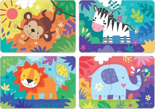 Zestaw zawiera cztery pojedyncze puzzle z motywami zwierząt – małpa, zebra, lew i słoń. Oprócz układania całych obrazków dzieci mogą także wyjmować i układać poszczególne zwierzątka oddzielnie. Wymiary gotowego puzzle to około 24 x 16 cm.