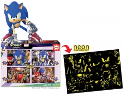 Cztery oddzielne puzzle o wymiarach 34 × 24 cm, ale z różną liczbą elementów (od 50 do 150), stopniowo pomagają doskonalić układanie i zwiększać poziom trudności. Puzzle progresywne = wraz ze wzrostem liczby elementów zmniejsza się ich rozmiar. Neonowe – fluorescencyjne puzzle świecące w ciemności z serii NEON FLUORESCENT. Na puzzle naniesiono fluorescencyjną warstwę farby, która w ciągu dnia pochłania światło, co powoduje, że w ciemności części puzzli świecą.