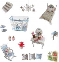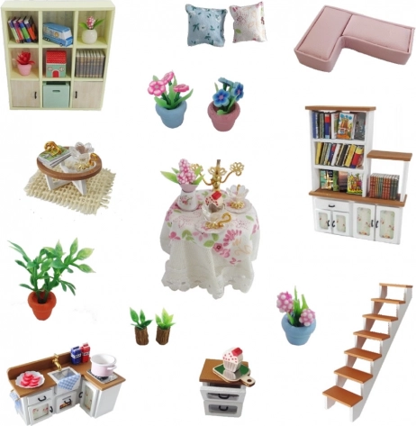 - elementy zestawu, meble i dodatki, oświetlenie LED, klej, linijka, pęseta, szczegółowa instrukcja